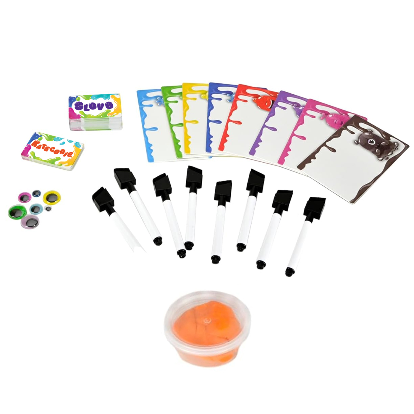 Podrobný popisBlobíci je kooperativní hra, ve které každý z hráčů začíná sám a postupně se spolu budou spojovat na základě stejných odpovědí! A spojovat se budou doslova, na začátku hry totiž každý z nich dostane malý kousek plastelíny s očičkem - svého blobíka. A jen stejnými odpověďmi se budou moci propojit v jeden velký veleblob. Hráči v každém kole otočí kartu kategorie (například zeměpis, film či jídlo) a jeden z nich vybere jednu ze tří karet se specifickým slovem. Poté všichni napíšou na tabulku svoji asociaci a následně si svá slova porovnají. Ti, kdo budou mít stejná, si spojí své blobíky a hrají dále spolu. Cílem je pak to, aby se během sedmi kol všichni propojili v jeden velký blob.