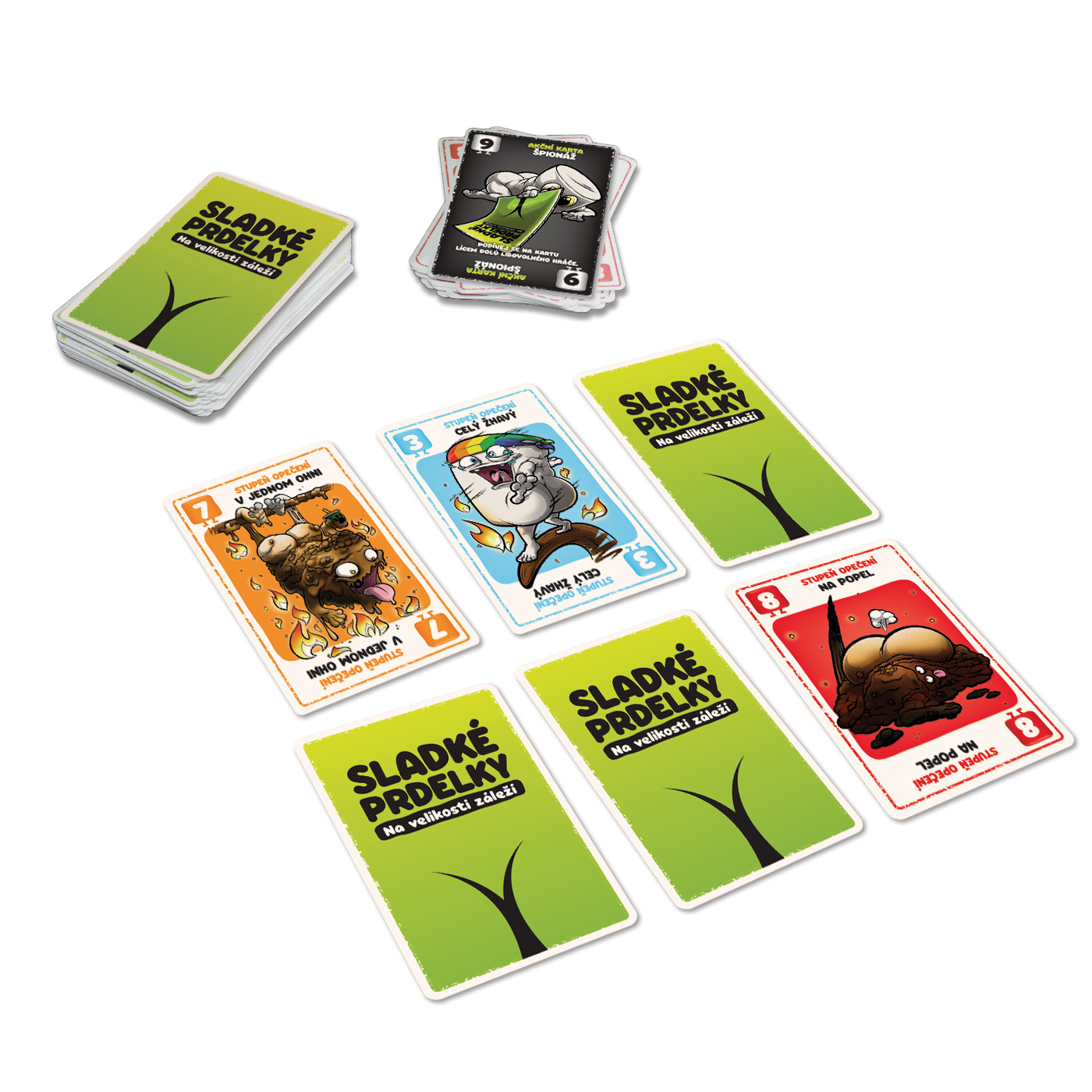 Podrobný popisVe hře Sladké prdelky chcete získat co nejméně bodů! Kdo má na konci kola nejnižší součet hodnot karet, vyhrává kolo. Kdo má po šesti kolech nejnižší celkové skóre, vyhrává hru.Hra obsahuje:62 hracích karet:1× hodnoty −4 a −24× hodnoty 0 až 78× hodnoty 8 až 10 4× hodnota 11