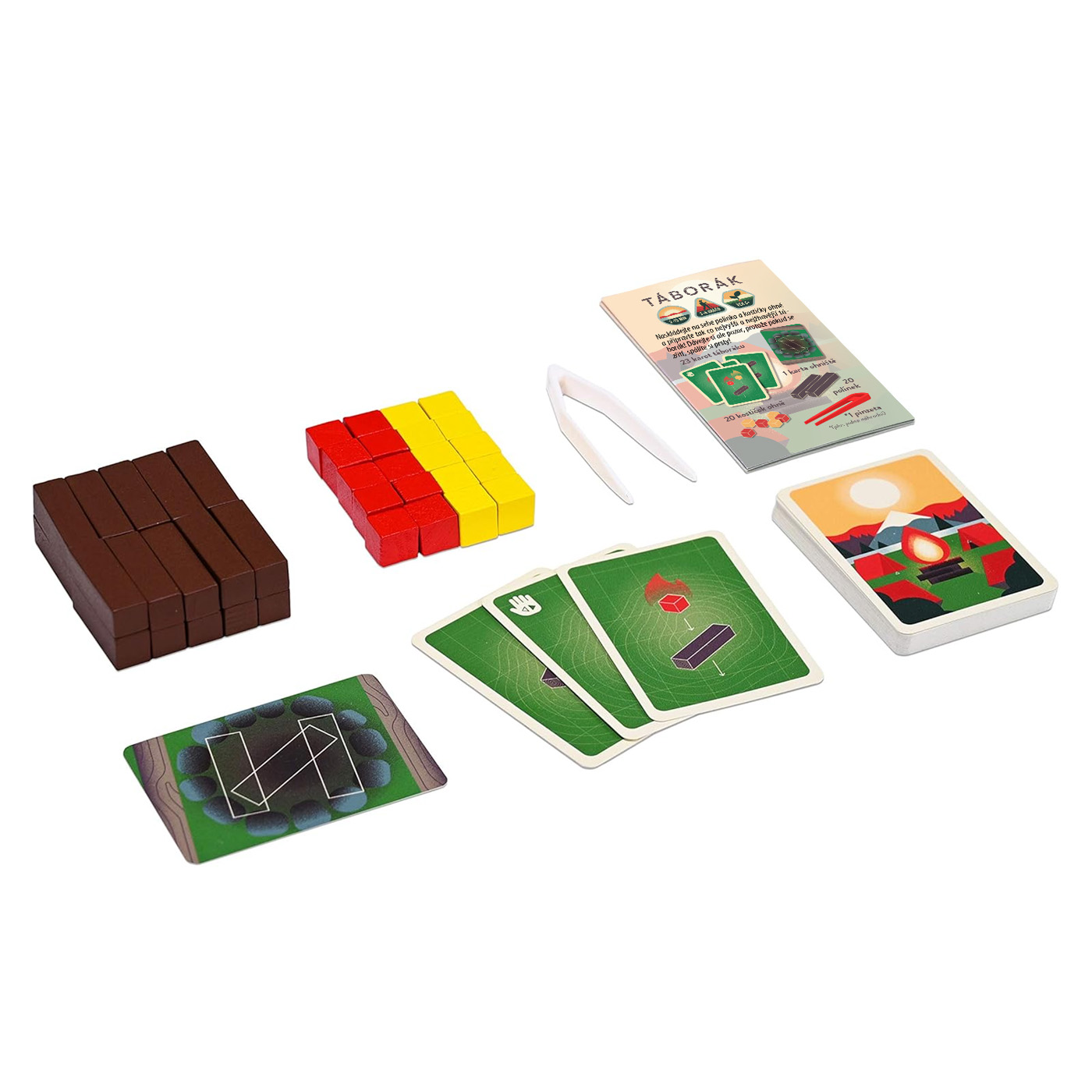 Podrobný popisTáborák je dovednostní hra, ve které hráči společně přikládají do ohně, ale nesmí jim z něj spadnout kostky! Hráč na tahu si vždy dober kartu, která mu ukazuje, co do táboráku přiložit. Poté musí pinzetkou přidat dané kostky do ohně, který postupně roste do výšky. Nesmí mu přitom ale nic spadnout, jinak vypadne ze hry. A s rostoucím ohněm je to čím dál těžší! Táborák je jednoduchá hra, u které si užijete spoustu legrace!